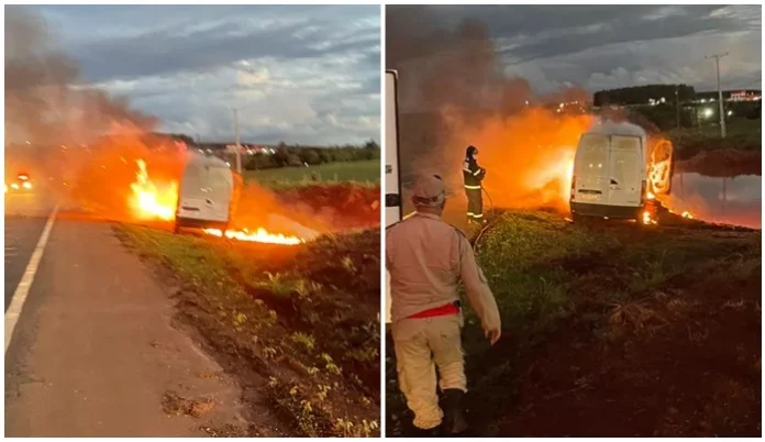 De acordo com informações iniciais, o motorista percebeu o início do fogo enquanto trafegava e conseguiu parar o veículo no acostamento. As chamas se espalharam rapidamente, destruindo a van e atingindo parte da vegetação próxima.