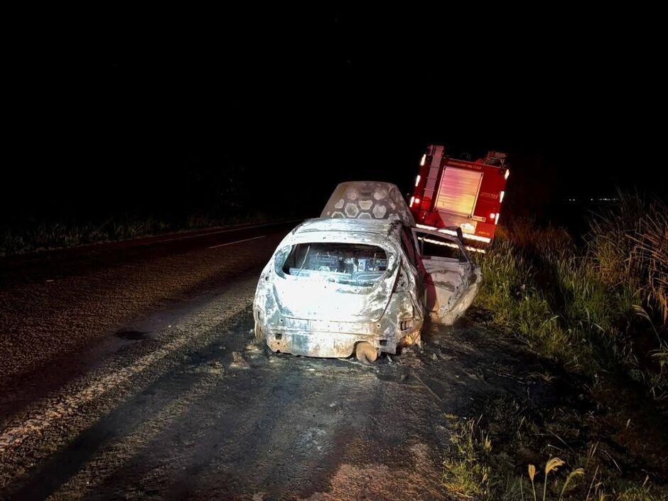 Na noite desta quinta-feira (19), uma veiculo ficou completamente destruído após pegar fogo na rodovia BR-163 aonde liga Nova Alvorada e Rio Brilhante.