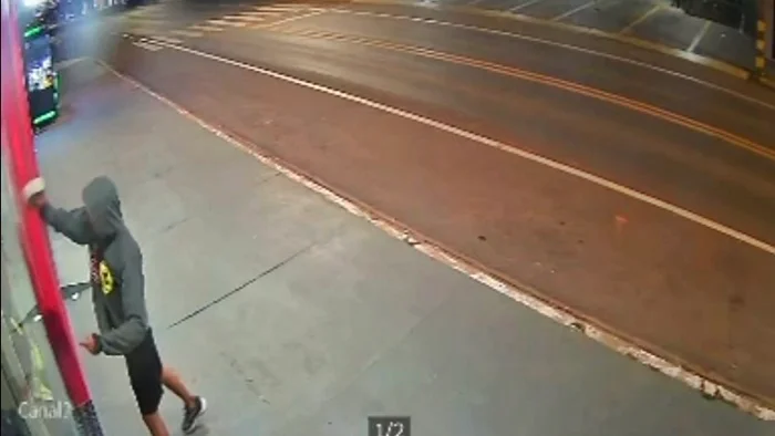 As imagens mostram um homem vestindo blusa cinza com capuz, bermuda preta e tênis se aproximando do estabelecimento. Em seguida, o suspeito retira uma pedra escondida na blusa, observa o entorno e utiliza o objeto para quebrar o vidro da vitrine.