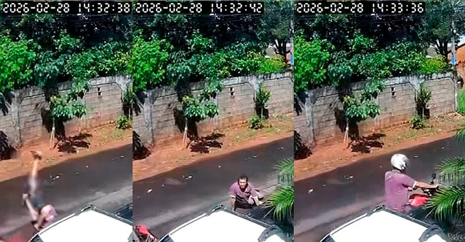 Câmeras de segurança registraram o momento da batida. Com a força do impacto, o condutor da moto foi arremessado ao solo. Apesar da queda, ele se levantou poucos segundos depois e deixou a cena sem prestar esclarecimentos.