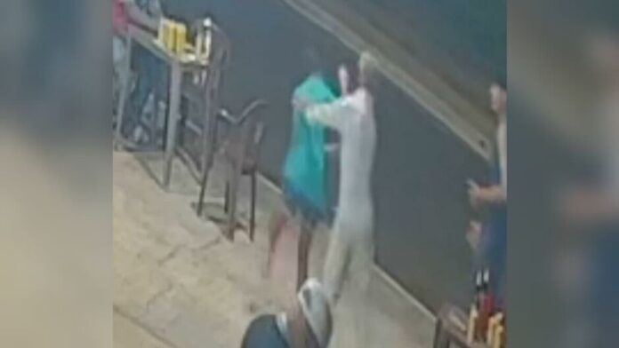 As imagens mostram a vítima consumindo uma cerveja quando o agressor se aproxima por trás de forma sorrateira. Ele rapidamente retira uma faca da cintura e desfere vários golpes contra a mulher.