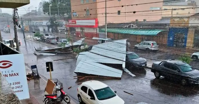 A cobertura de zinco da Secretaria de Educação foi lançada contra um veículo que estava estacionado em frente ao prédio e também atingiu fios da rede elétrica, agravando os danos na região. O temporal veio acompanhado de granizo e ventos fortes, que resultaram ainda na queda de árvores, destelhamentos e prejuízos à infraestrutura elétrica.