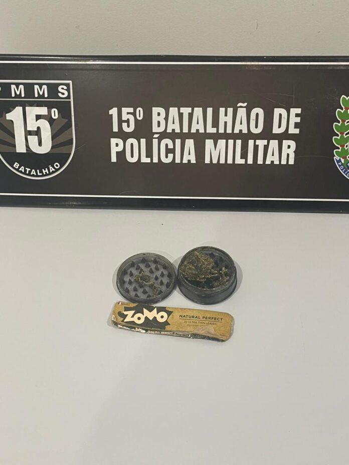 Durante a abordagem policial, foi localizada no bolso do short do autor uma porção de aproximadamente 05 gramas de substância esverdeada, aparentemente maconha, além de um objeto conhecido como dichavador e papéis de seda, comumente utilizados para o consumo da droga.